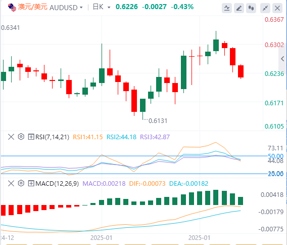 澳大利亚统计局报告称,2024年第四季度(Q4)消费者物价指数(CPI)环比上升0.2%,年通胀率从上一季度的2.8%降至2.4%。此外,修正均值——核心通胀的关键指标——上季度仅上升0.5%,为2021年中期以来的最小增幅,年增长率放缓至3.2%。市场迅速反应,目前预计澳储行将在2月18日的政策会议上将现金利率下调25个基点的概率为80%。除此之外,中国的经济困境和美中贸易战的担忧进一步加剧了与中国相关的澳元的卖压。