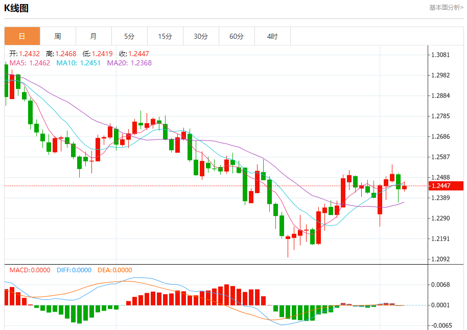 汇价高见1.2468,低见1.2419。上一交易日,汇价收于1.2432。