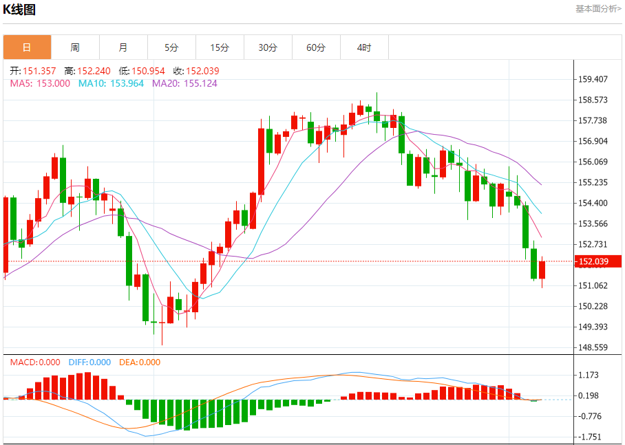 汇价高见152.240,低见150.954。上一交易日,汇价收于151.359。