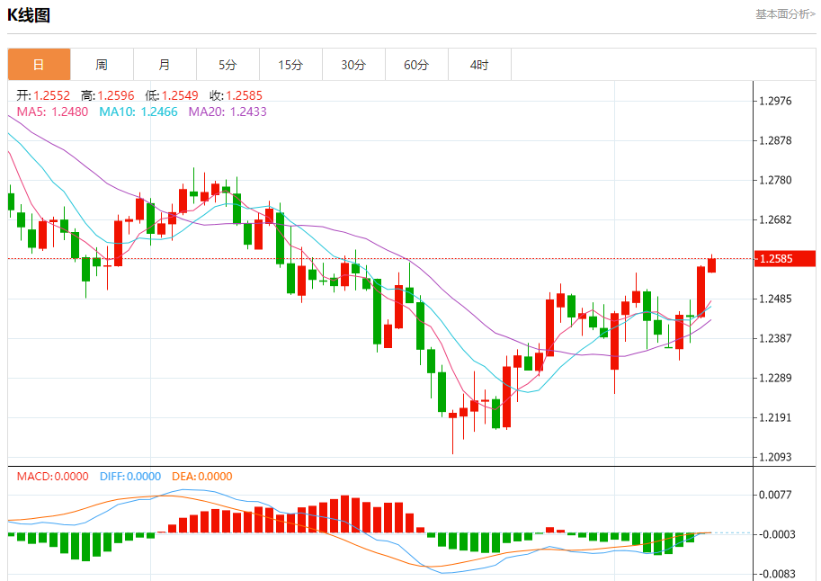 汇价高见1.2596,低见1.2549。上一交易日,汇价收于1.2565。
