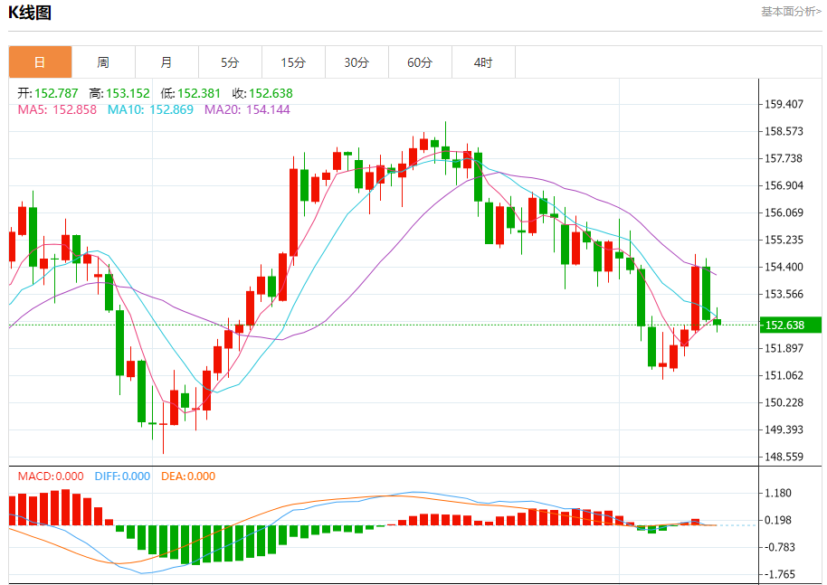 汇价高见153.152,低见152.388。上一交易日,汇价收于152.789。