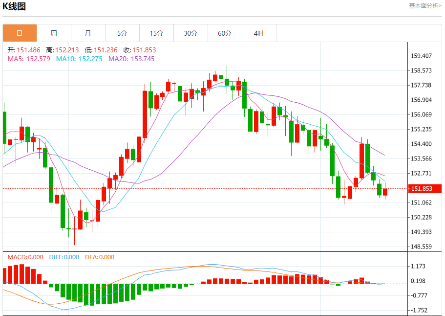 汇价高见152.213,低见151.236。上一交易日,汇价收于151.497。