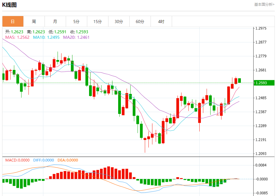 汇价高见1.2623,低见1.2591。上一交易日,汇价收于1.2623。
