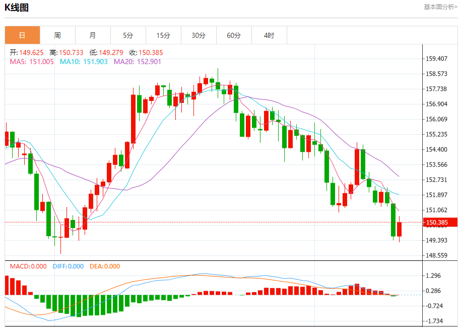 汇价高见150.733,低见149.279。上一交易日,汇价收于149.628。