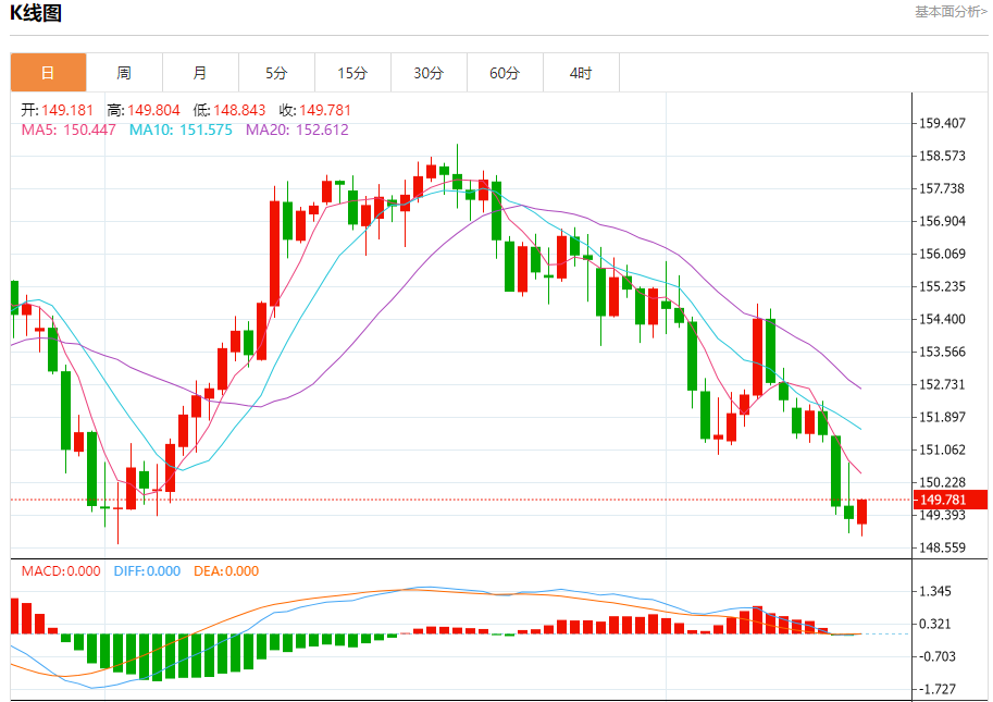 汇价高见149.791,低见148.843。上一交易日,汇价收于149.312。