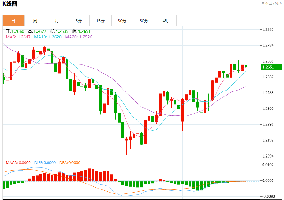 汇价高见1.2677,低见1.2635。上一交易日,汇价收于1.2662。