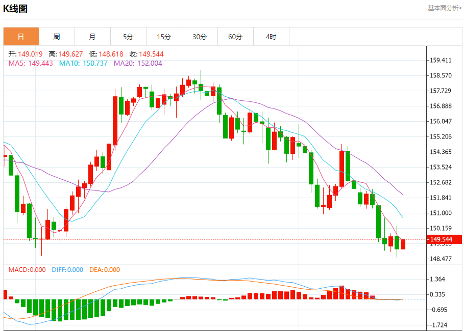 汇价高见149.627,低见148.623。上一交易日,汇价收于149.025。