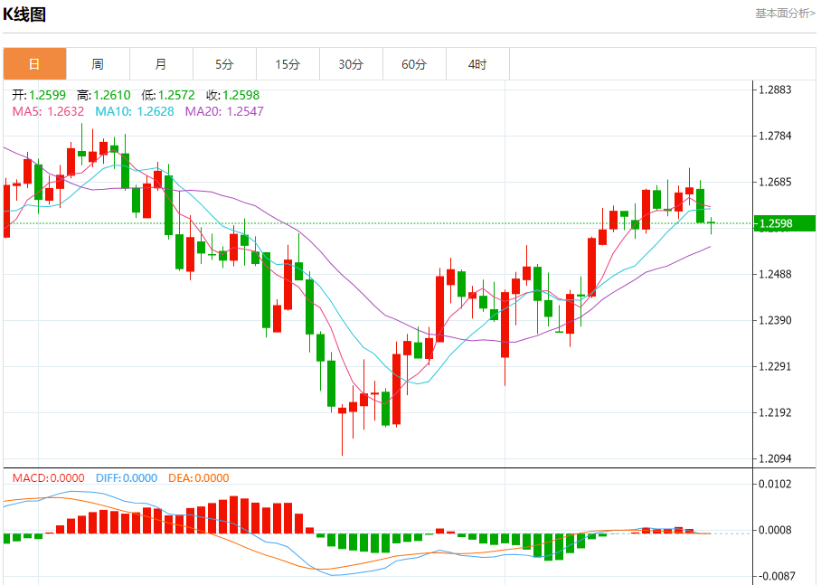 汇价高见1.2610,低见1.2573。上一交易日,汇价收于1.2600。