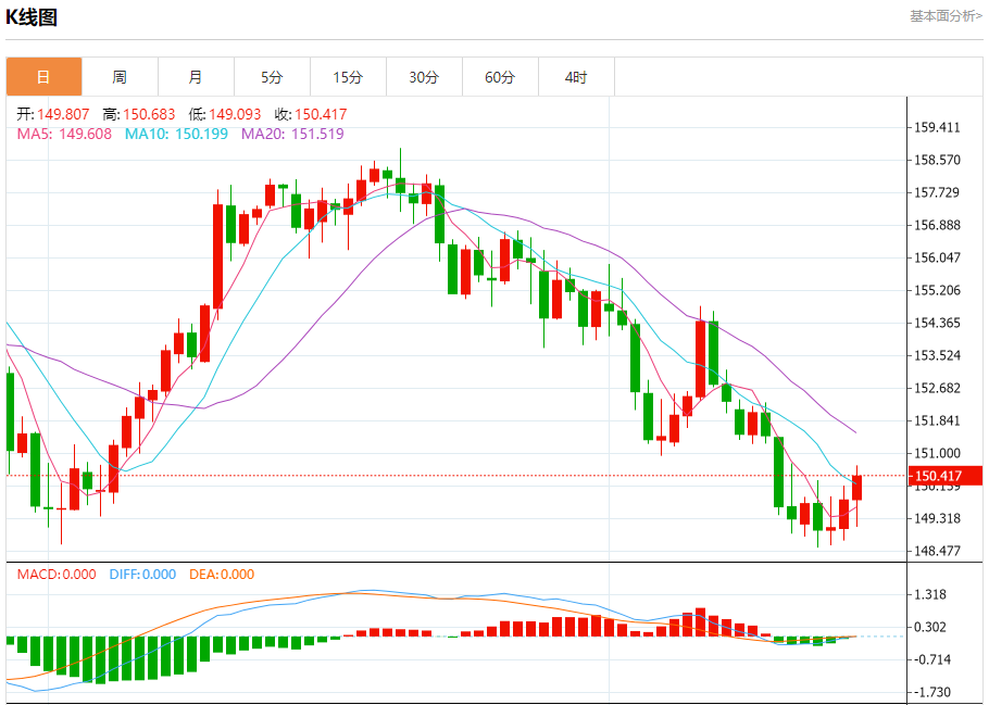 汇价高见150.683,低见149.093。上一交易日,汇价收于149.802。