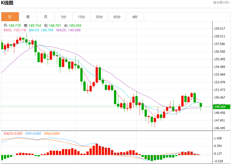 汇价高见149.754,低见148.700。上一交易日,汇价收于149.876。