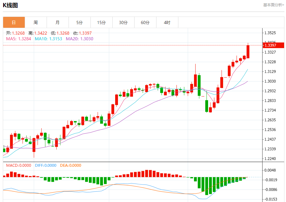 汇价高见1.3422,低见1.3268。上一交易日,汇价收于1.3291。