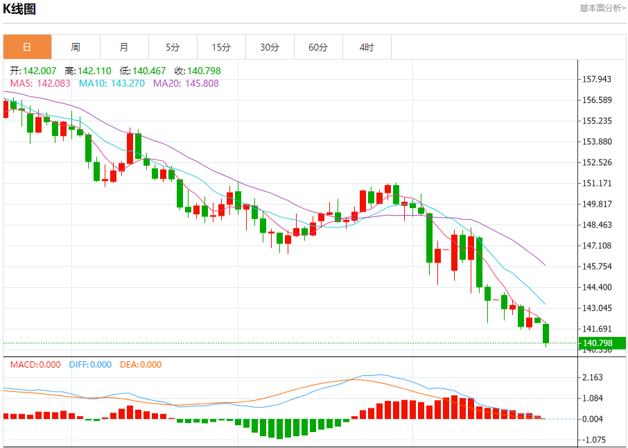汇价高见142.110,低见140.467。上一交易日,汇价收于142.108。