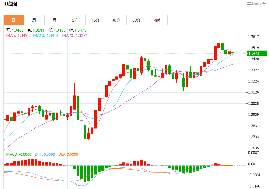 汇价高见1.3510,低见1.3455。上一交易日,汇价收于1.3487。