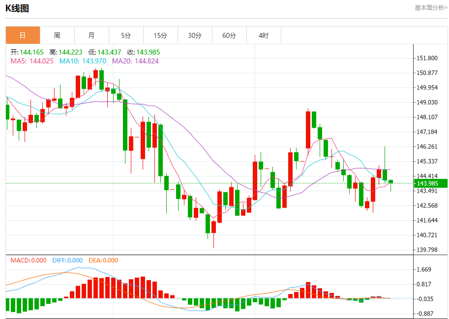 汇价高见144.214,低见143.427。上一交易日,汇价收于144.164。