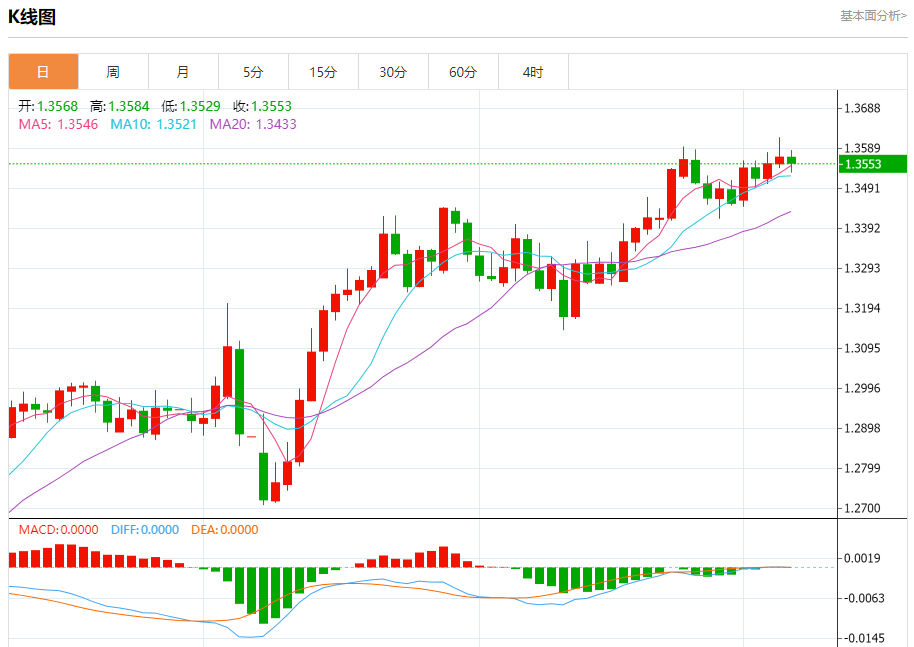 汇价高见1.3584,低见1.3529。上一交易日,汇价收于1.3570。
