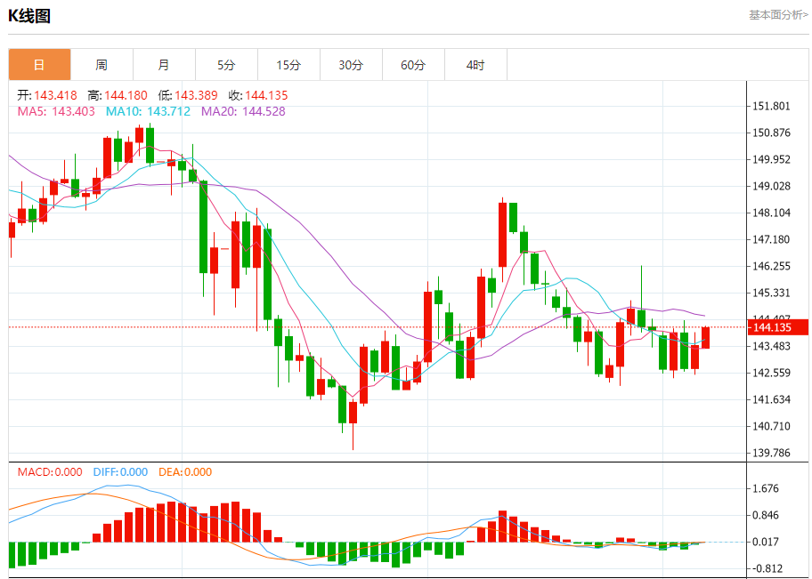 汇价高见144.180,低见143.389。上一交易日,汇价收于143.505。