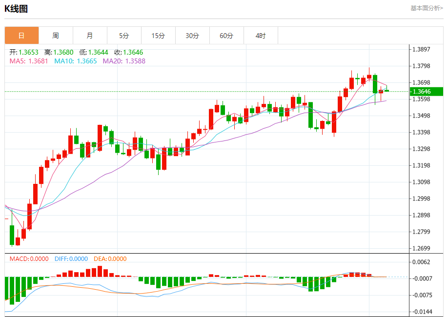 汇价高见1.3681,低见1.3644。上一交易日,汇价收于1.3654。