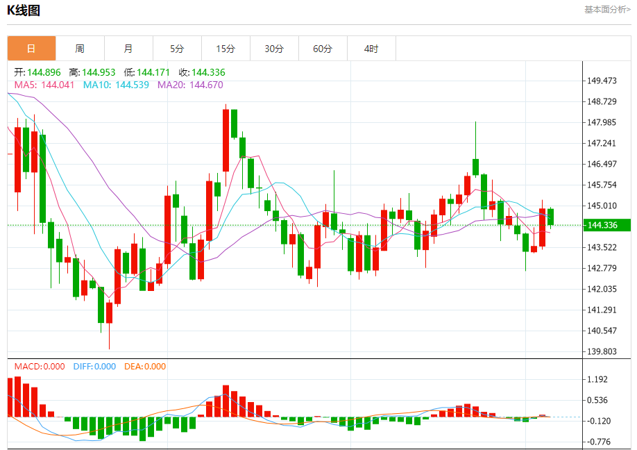汇价高见144.953,低见144.171。上一交易日,汇价收于144.905。