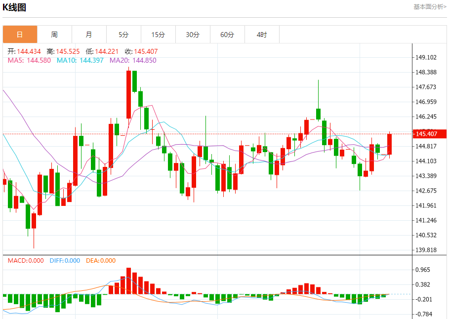 汇价高见145.525,低见144.221。上一交易日,汇价收于144.430。