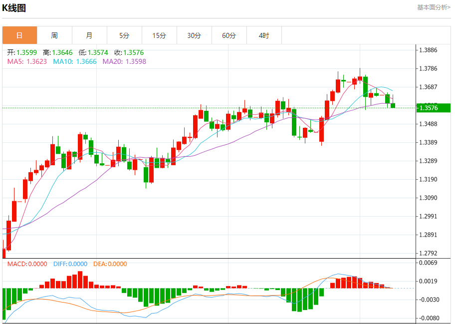 汇价高见1.3646,低见1.3574。上一交易日,汇价收于1.3600。