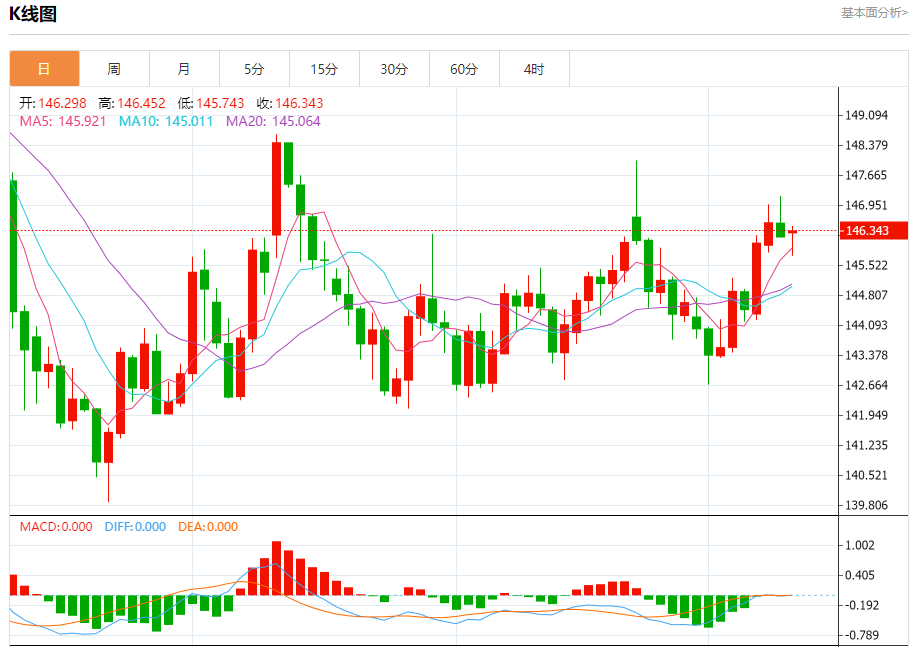 汇价高见146.463,低见145.751。上一交易日,汇价收于146.307。