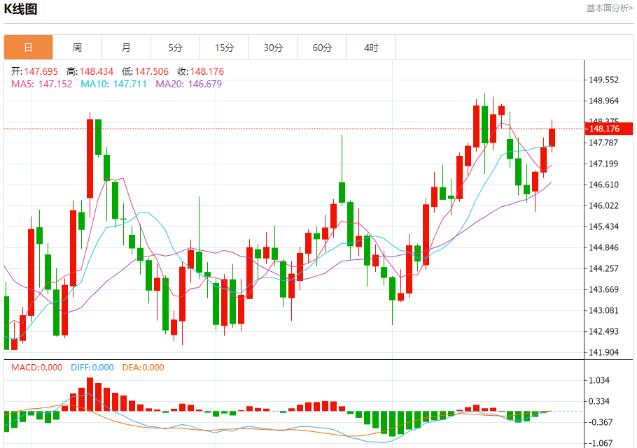 汇价高见148.434,低见147.506。上一交易日,汇价收于147.656。
