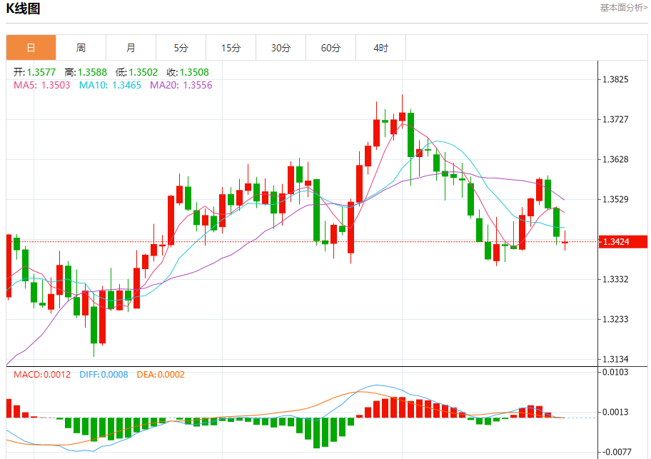 汇价高见1.3452,低见1.3402。上一交易日,汇价收于1.3438。