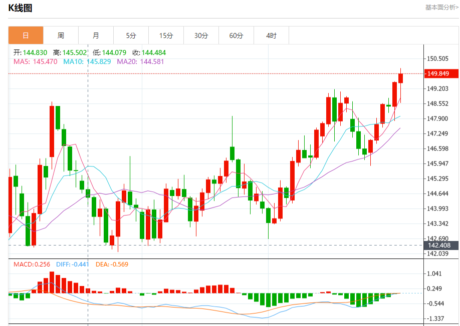汇价高见150.097,低见148.585。上一交易日,汇价收于149.476。