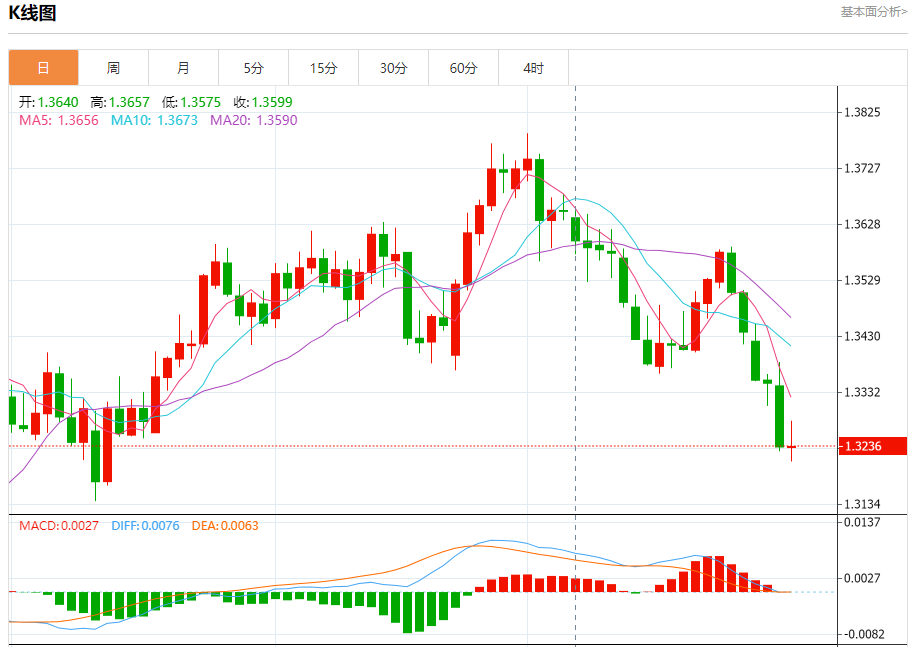 汇价高见1.3281,低见1.3209。上一交易日,汇价收于1.3236。