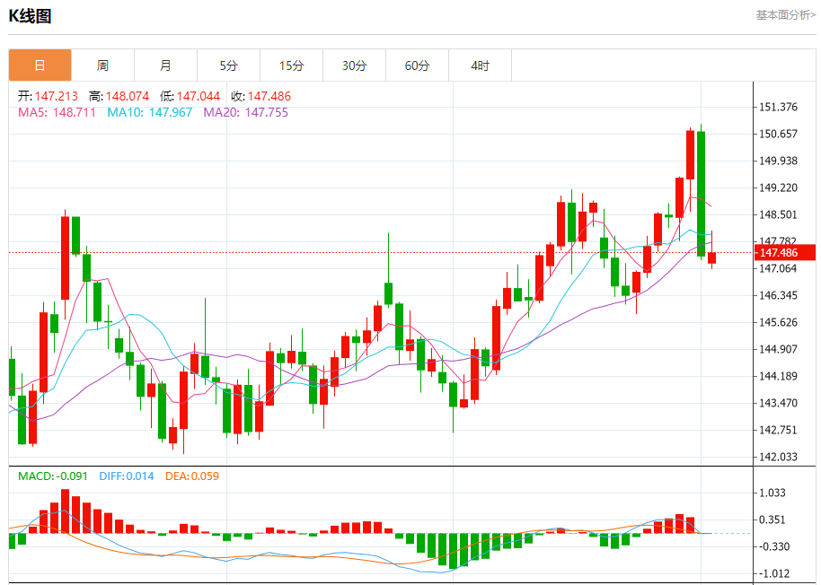 汇价高见148.074,低见147.044。上一交易日,汇价收于147.372。