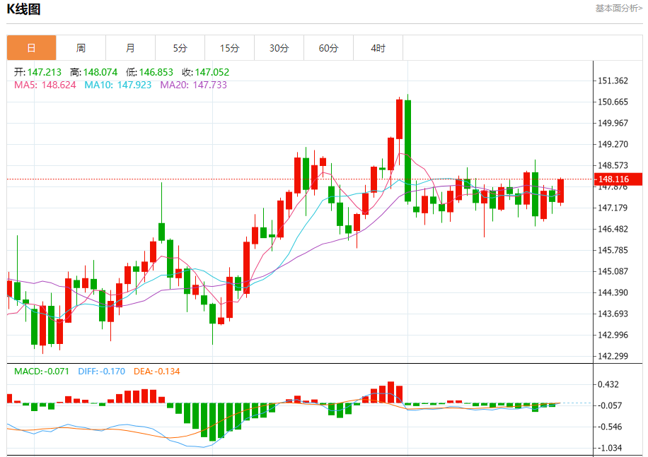 汇价高见148.170,低见147.234。上一交易日,汇价收于147.314。
