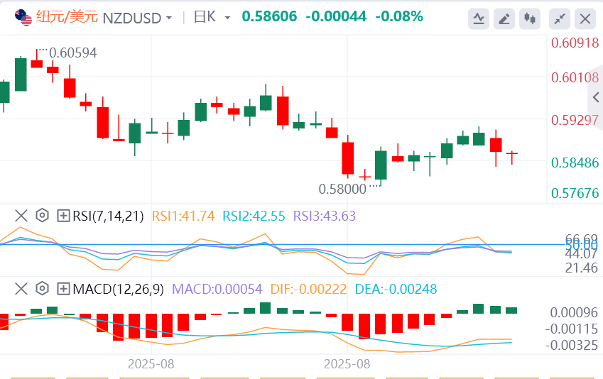 本周早些时候,纽元在两周高点0.5915附近被拒绝,并在周三欧洲早盘交易时段回到0.5850下方,空头瞄准周二低点0.5835附近。