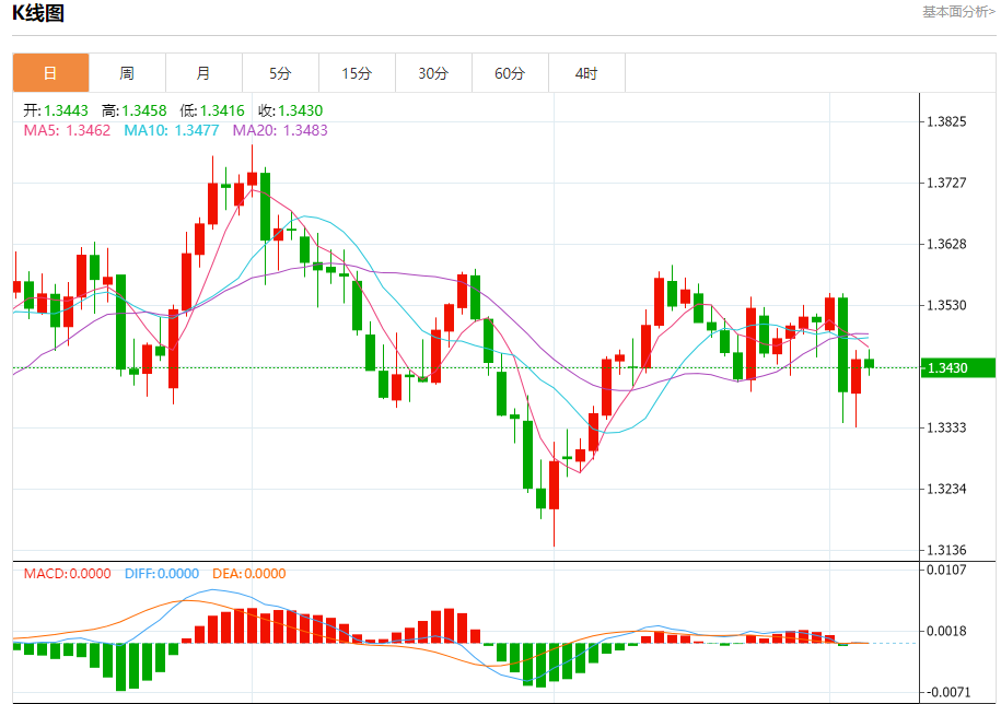 汇价高见1.3459,低见1.3416。上一交易日,汇价收于1.3443。