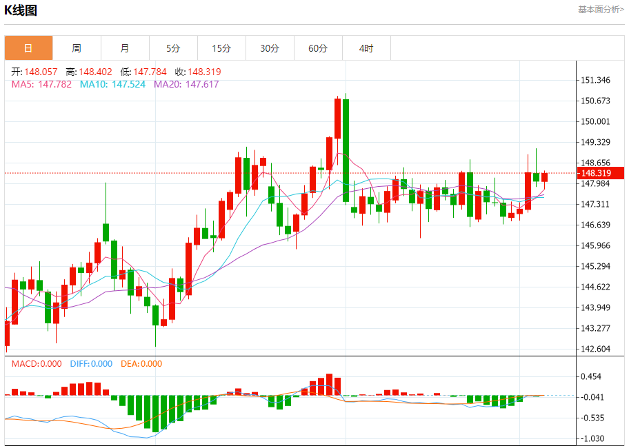 汇价高见148.402,低见147.784。上一交易日,汇价收于148.062。