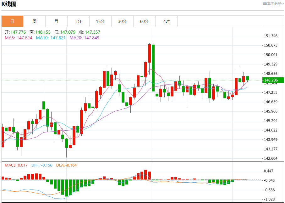 汇价高见148.512,低见148.078。上一交易日,汇价收于148.483。