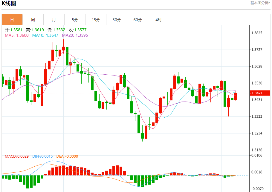 汇价高见1.3485,低见1.3418。上一交易日,汇价收于1.3433。