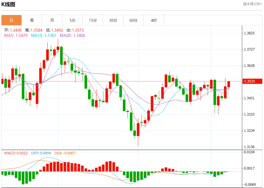 汇价高见1.3536,低见1.3482。上一交易日,汇价收于1.3502。