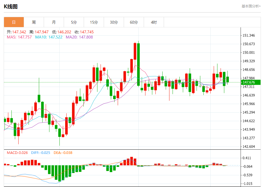 汇价高见148.573,低见147.461。上一交易日,汇价收于147.389。