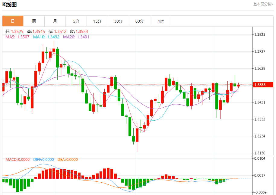 汇价高见1.3545,低见1.3512。上一交易日,汇价收于1.3526。