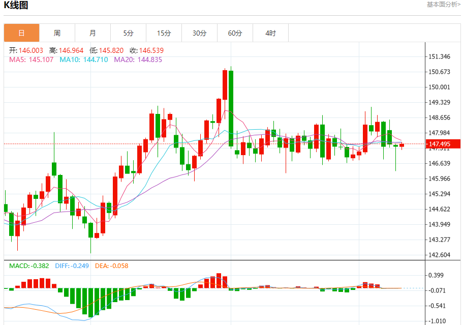 汇价高见147.574,低见147.225。上一交易日,汇价收于147.400。