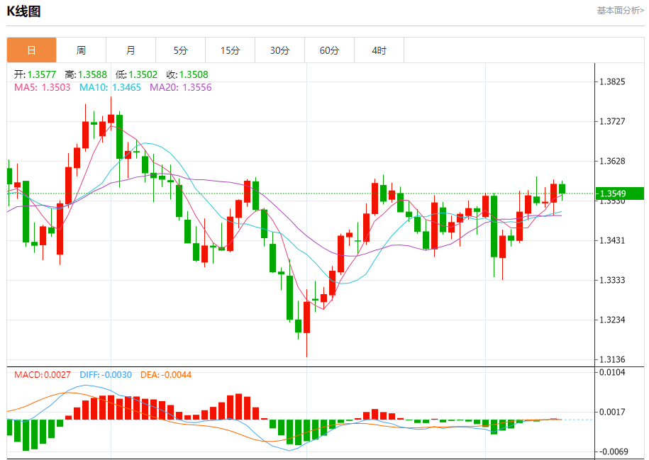 汇价高见1.3580,低见1.3530。上一交易日,汇价收于1.3571。