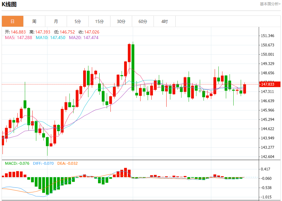 汇价高见147.980,低见147.121。上一交易日,汇价收于147.188。