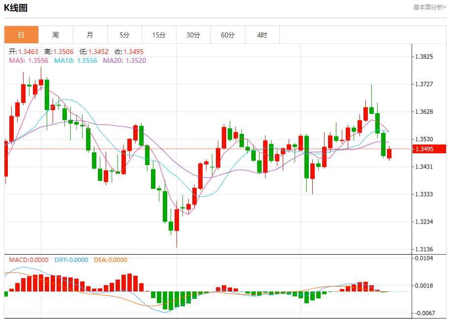 汇价高见1.3506,低见1.3453。上一交易日,汇价收于1.3468。