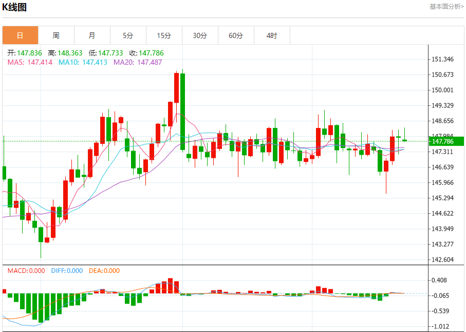 汇价高见148.371,低见147.742。上一交易日,汇价收于147.974。
