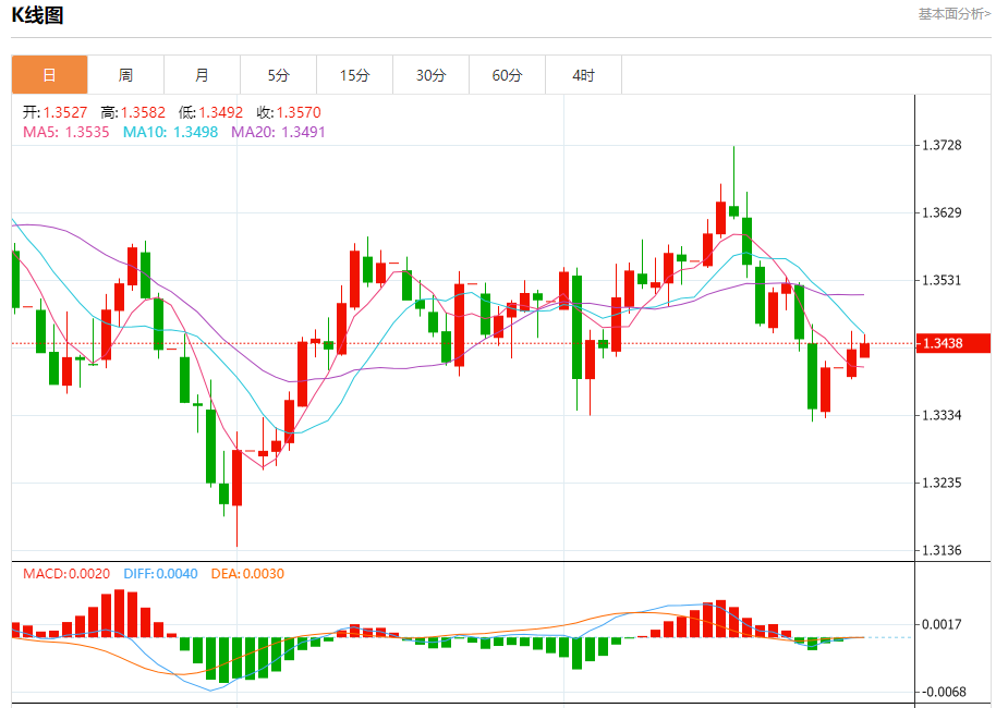 汇价高见1.3451,低见1.3420。上一交易日,汇价收于1.3430。