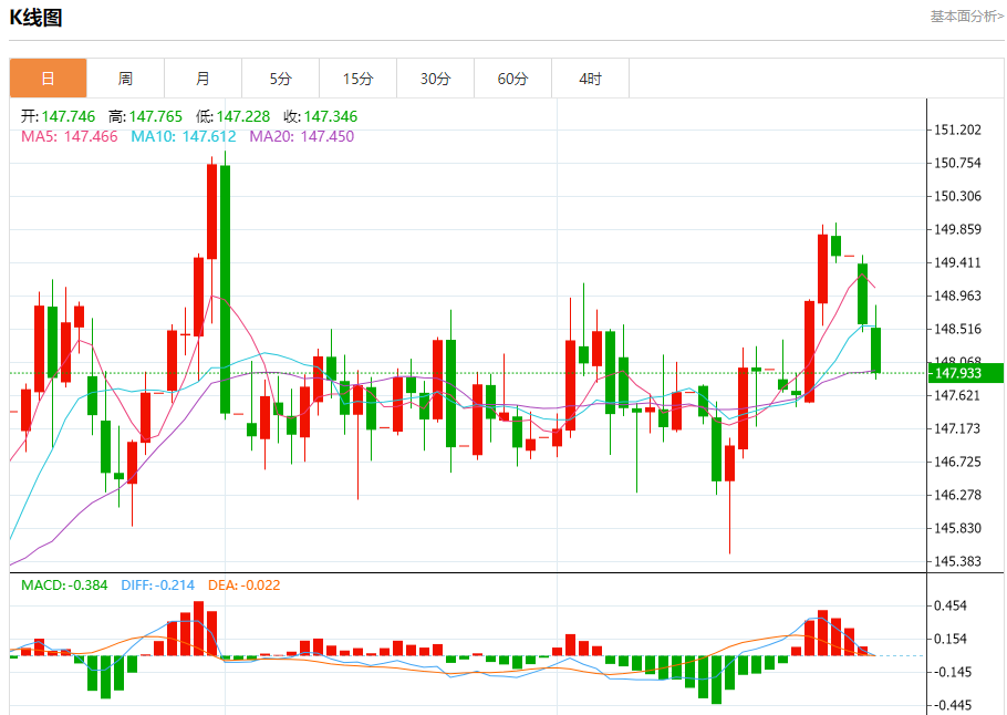 汇价高见148.831,低见147.820。上一交易日,汇价收于148.590。