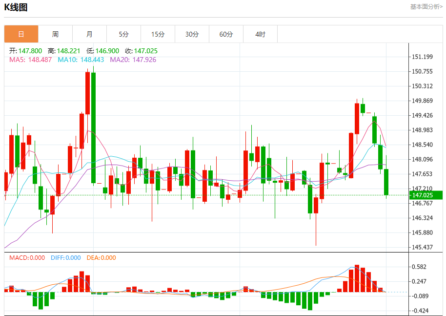 汇价高见148.213,低见146.890。上一交易日,汇价收于147.804。
