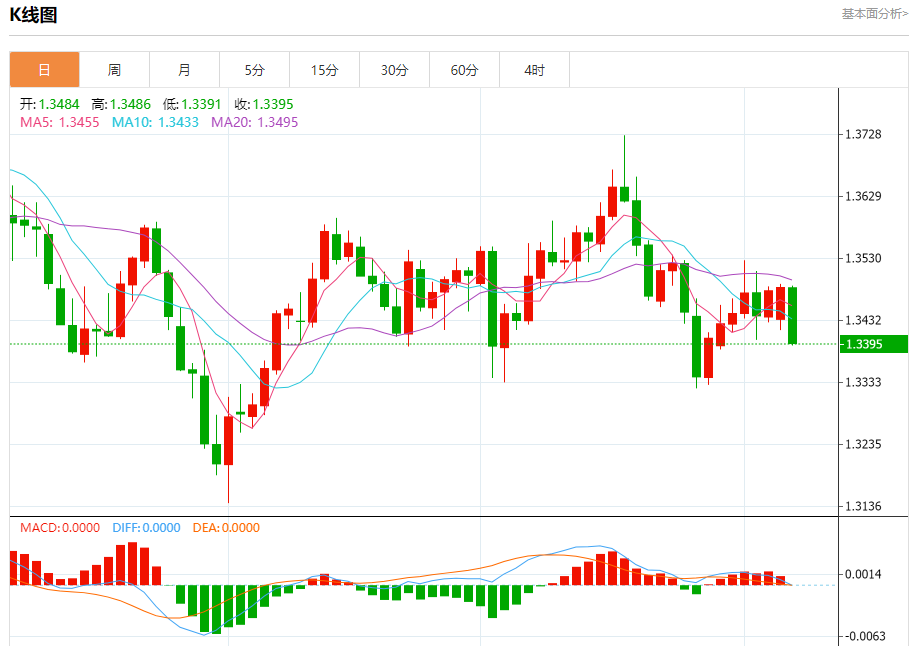 汇价高见1.3487,低见1.3391。上一交易日,汇价收于1.3484。