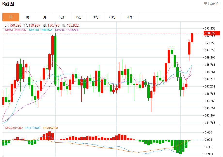 汇价高见150.937,低见150.193。上一交易日,汇价收于150.342。