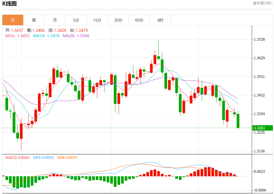 汇价高见1.3352,低见1.3252。上一交易日,汇价收于1.3332。